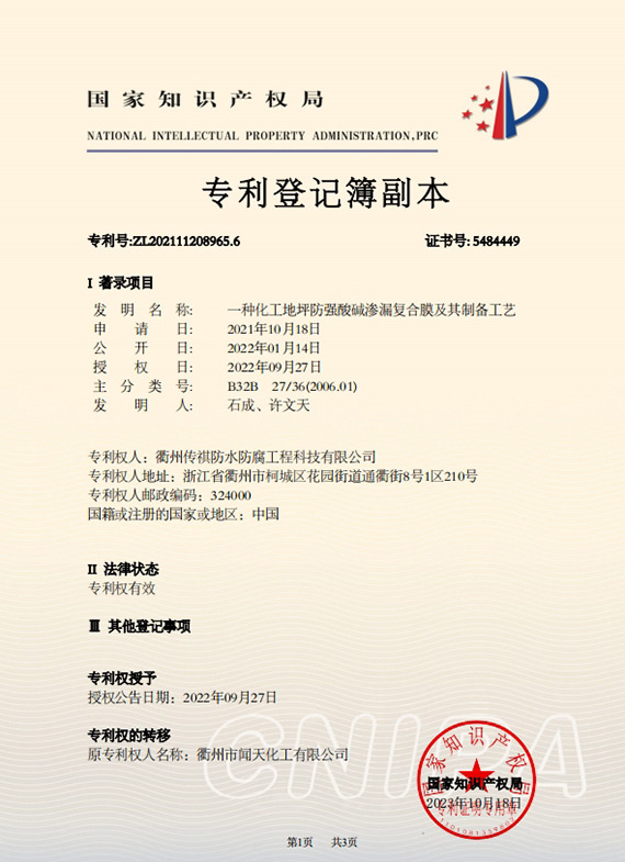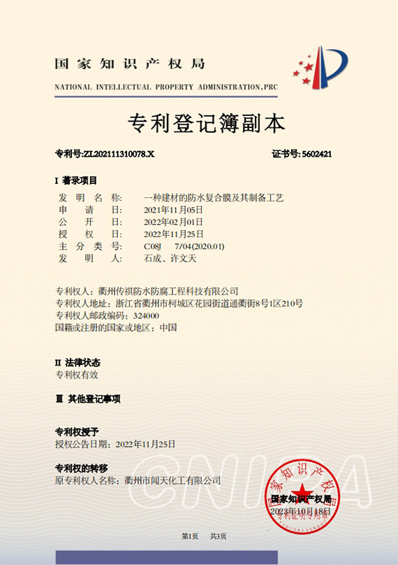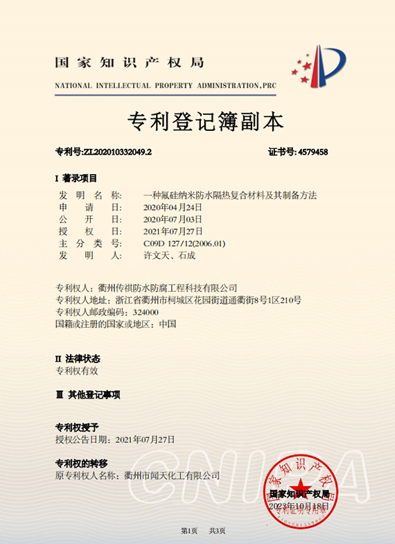 衢州傳祺新材料科技有限公司是衢州市聞天化工有限公司的下屬企業(yè);衢州市聞天化工有限公司成立于2003年,是國內(nèi)最早研發(fā)、生產(chǎn)氟碳涂料的企業(yè)之一。衢州傳祺新材料科技有限公司成立于2017年,公司專注于高分子氟材料的開發(fā)和含氟材料在防腐、防水領(lǐng)域的應(yīng)用。經(jīng)過6年的不懈努力,已獲得了化工和建筑領(lǐng)域六項國家發(fā)明專利授權(quán)和兩項新產(chǎn)品科技成果獎,參與了中國建筑材料流通協(xié)會《房屋修繕防水工程規(guī)范》標(biāo)準(zhǔn)的編制工作,中建協(xié)涂裝委員會浙西工作站設(shè)立在我公司。